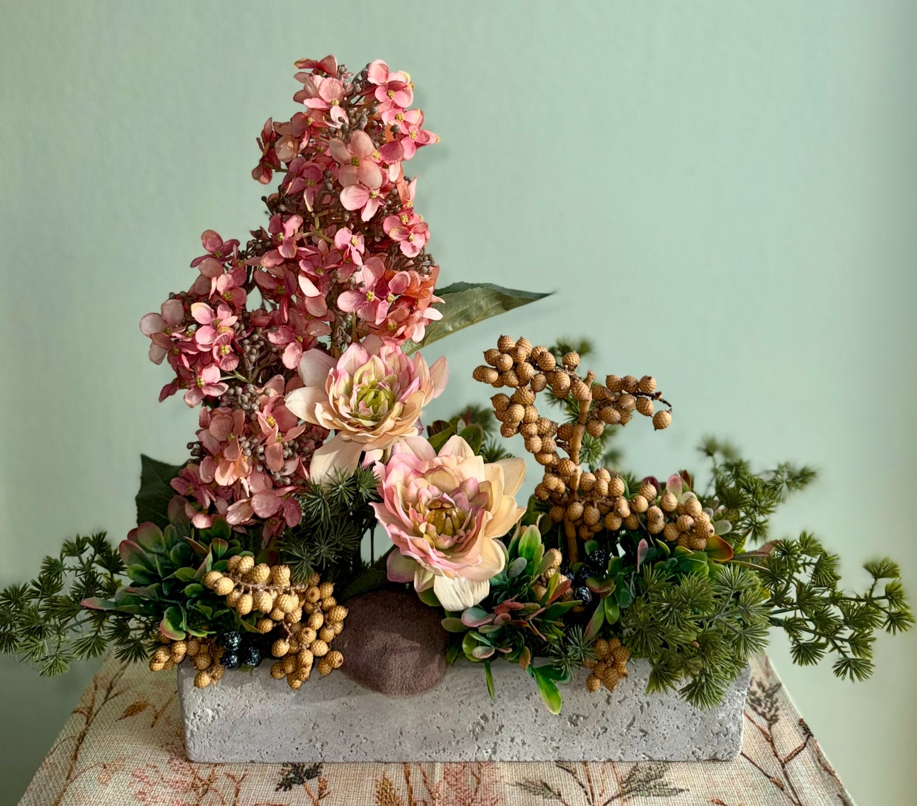 • Kompozycja w podłużnej betonowej donicy