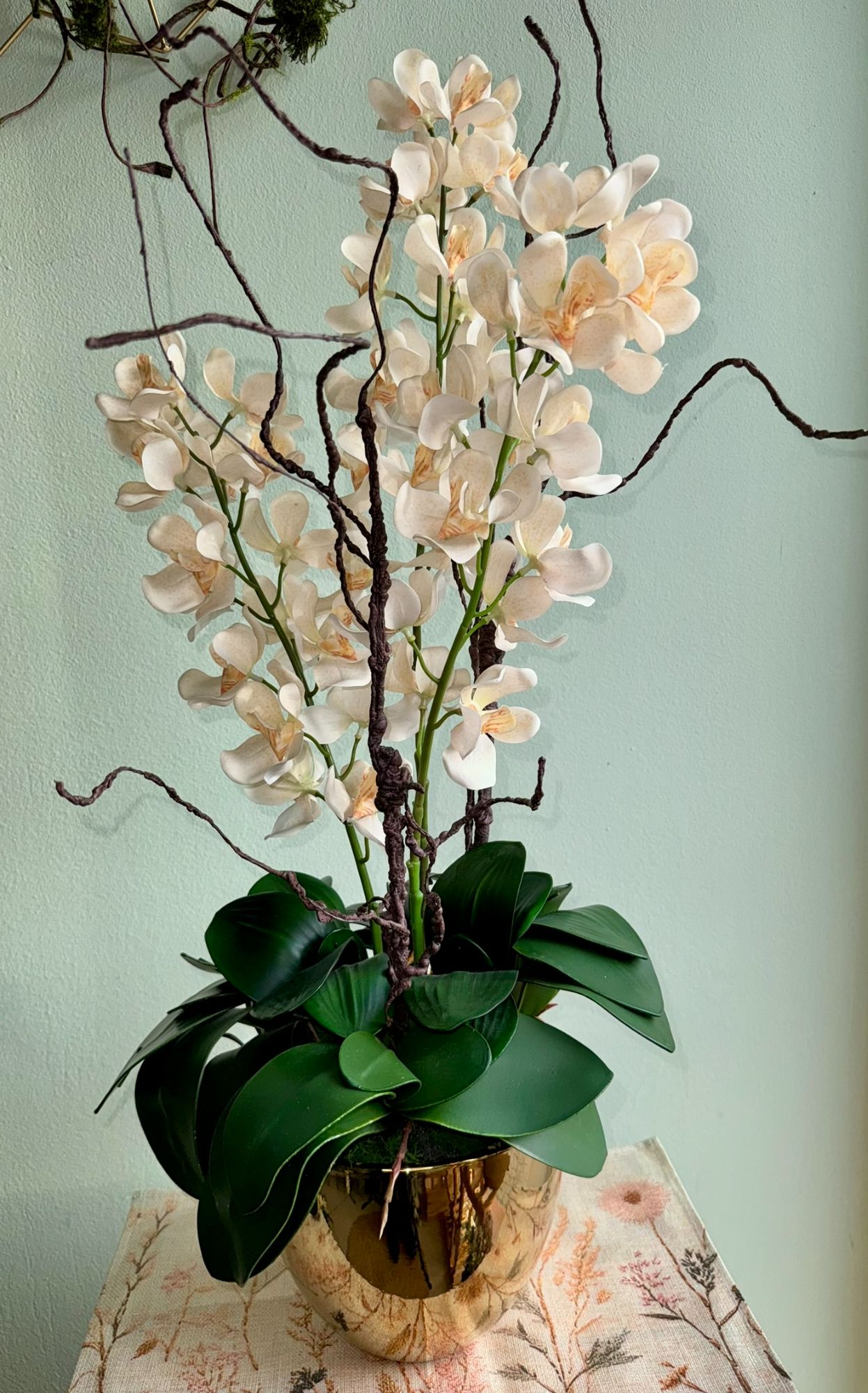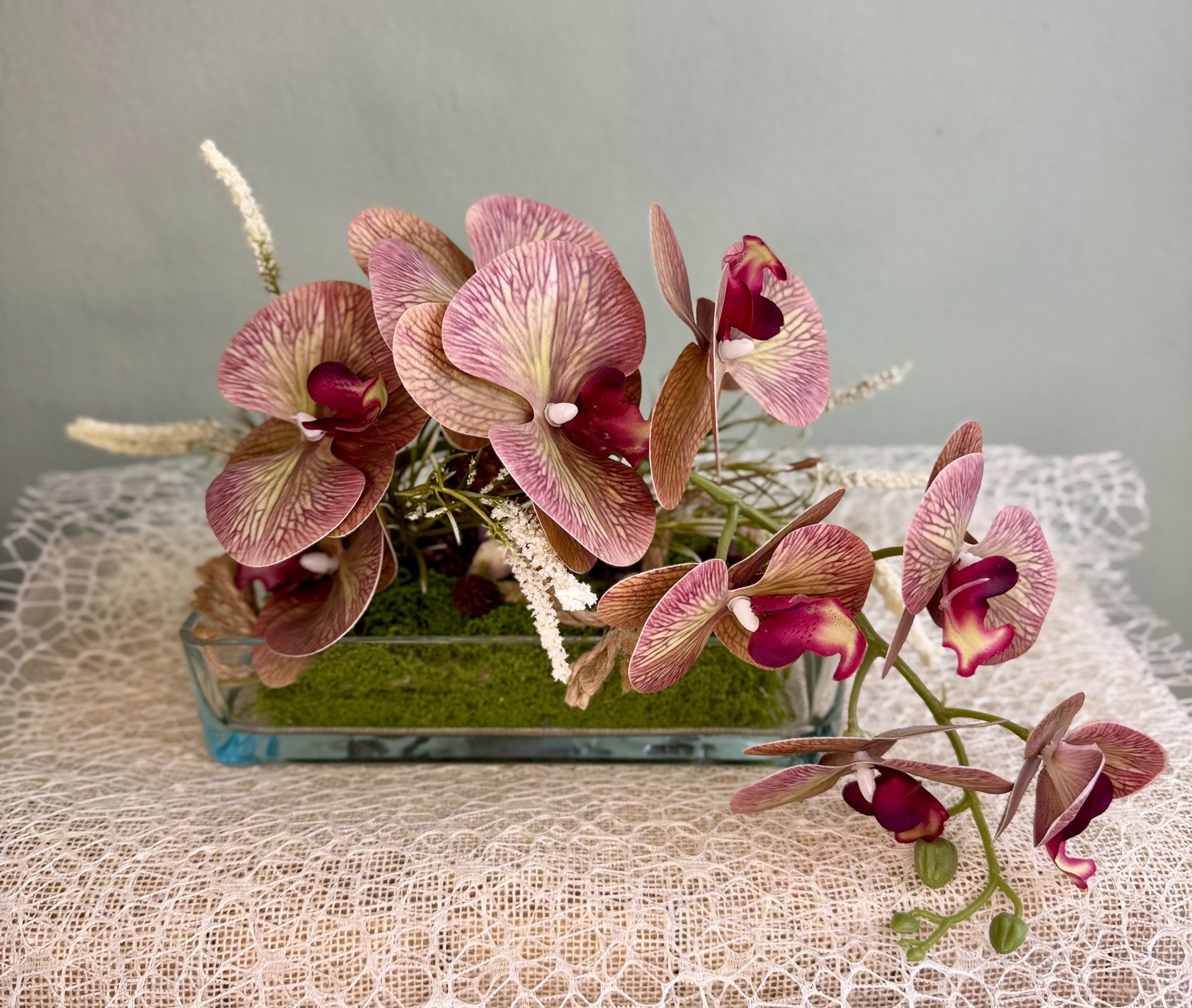 • Storczyk w szkle z dekoracynymi gałązkami i mchem.