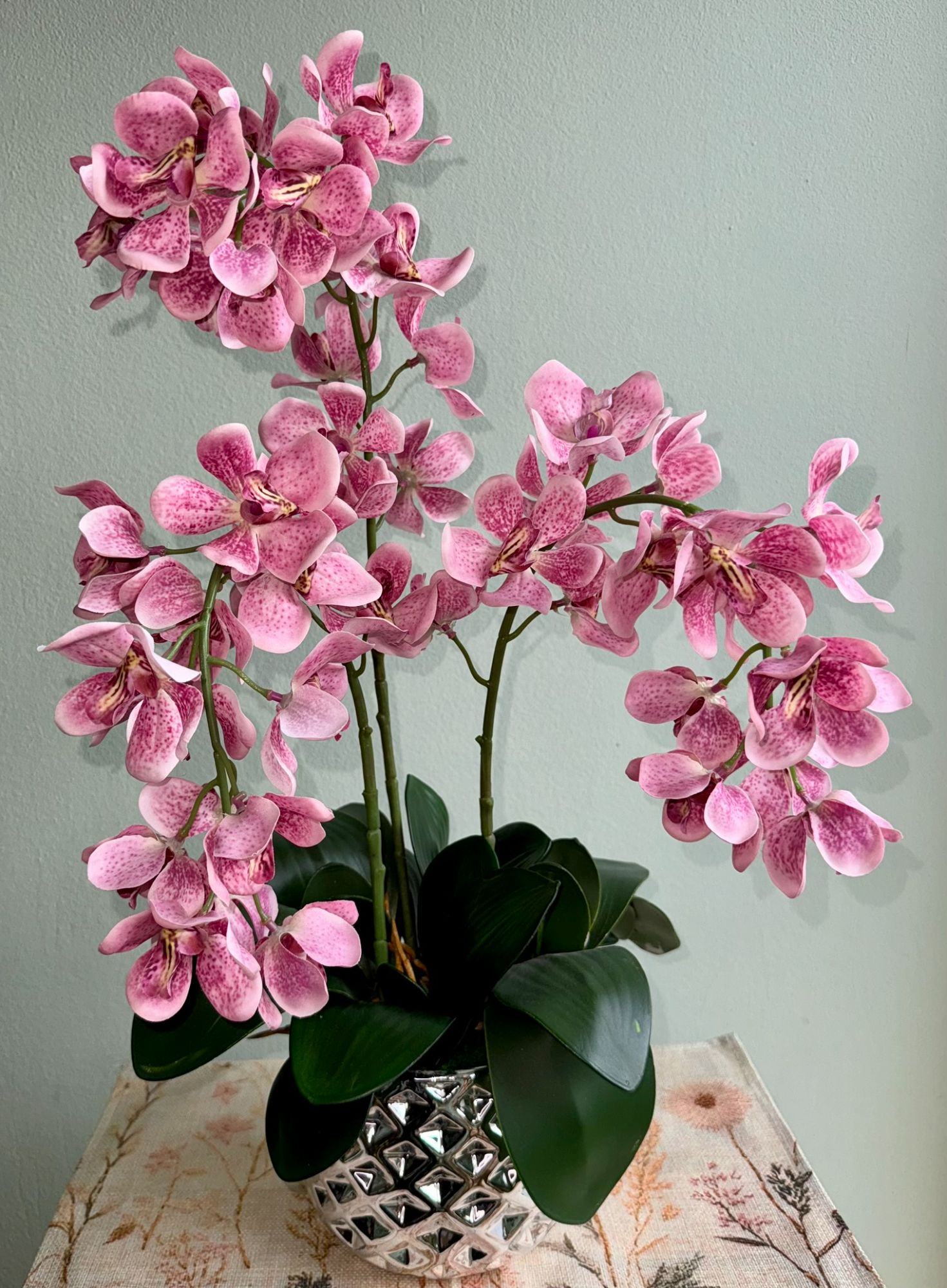 • Storczyk różowy 3 pędowy w srebrnej donicy.