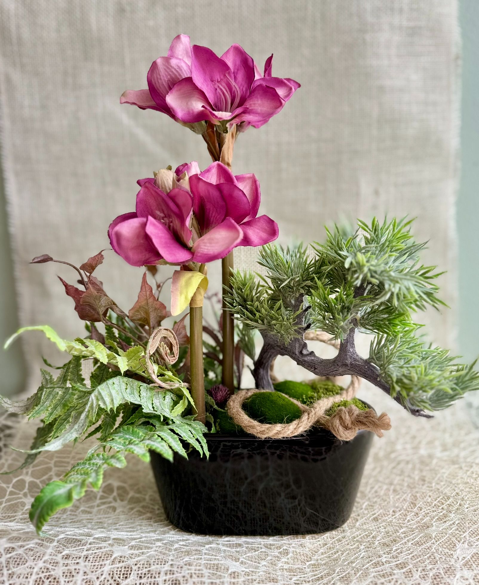 • Kompozycja z paprocią i bonsai w czarnej ceramicznej donicy.
