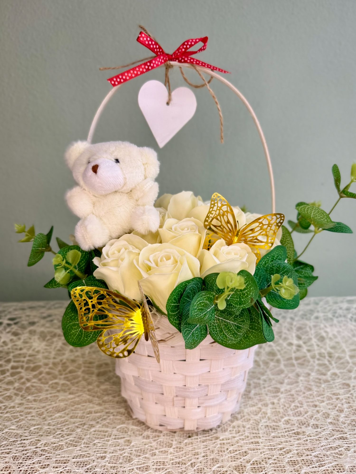 • Koszyczek z kwiatami mydlanymi i misiem.