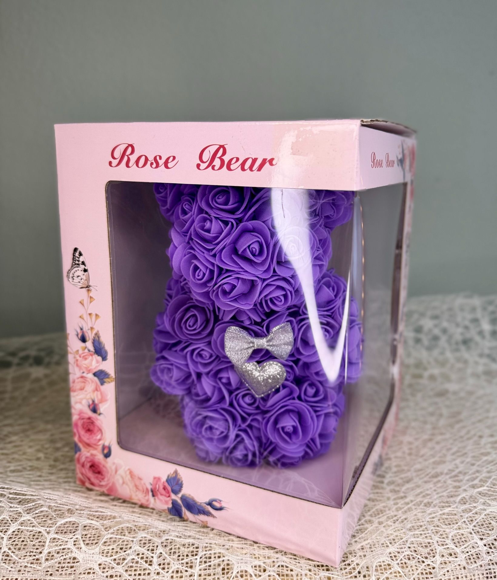 • Fioletowy miś z piankowych róż