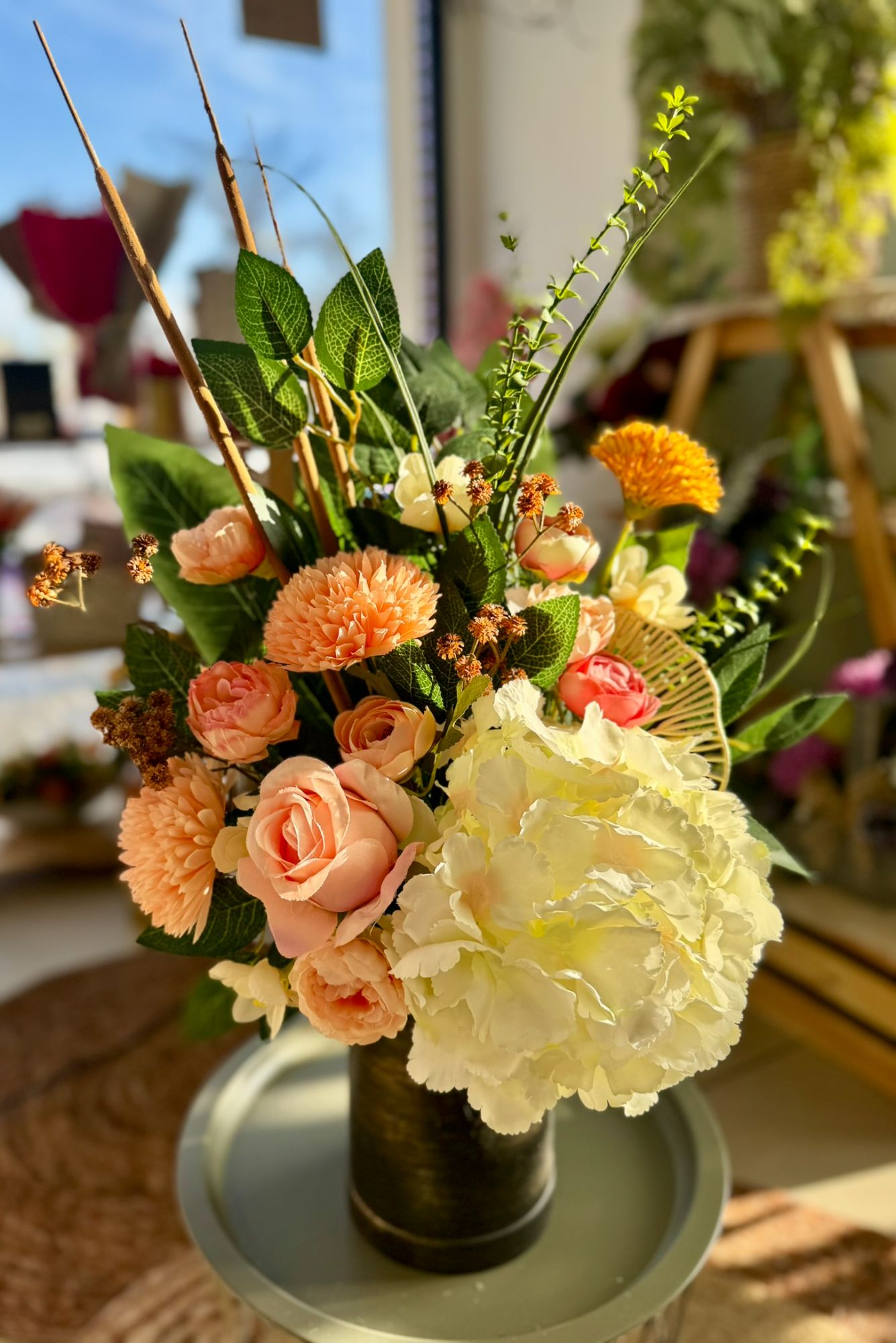 • Kompozycja z poprocią i dekoracyjnym drewnem w słomkowej donicy