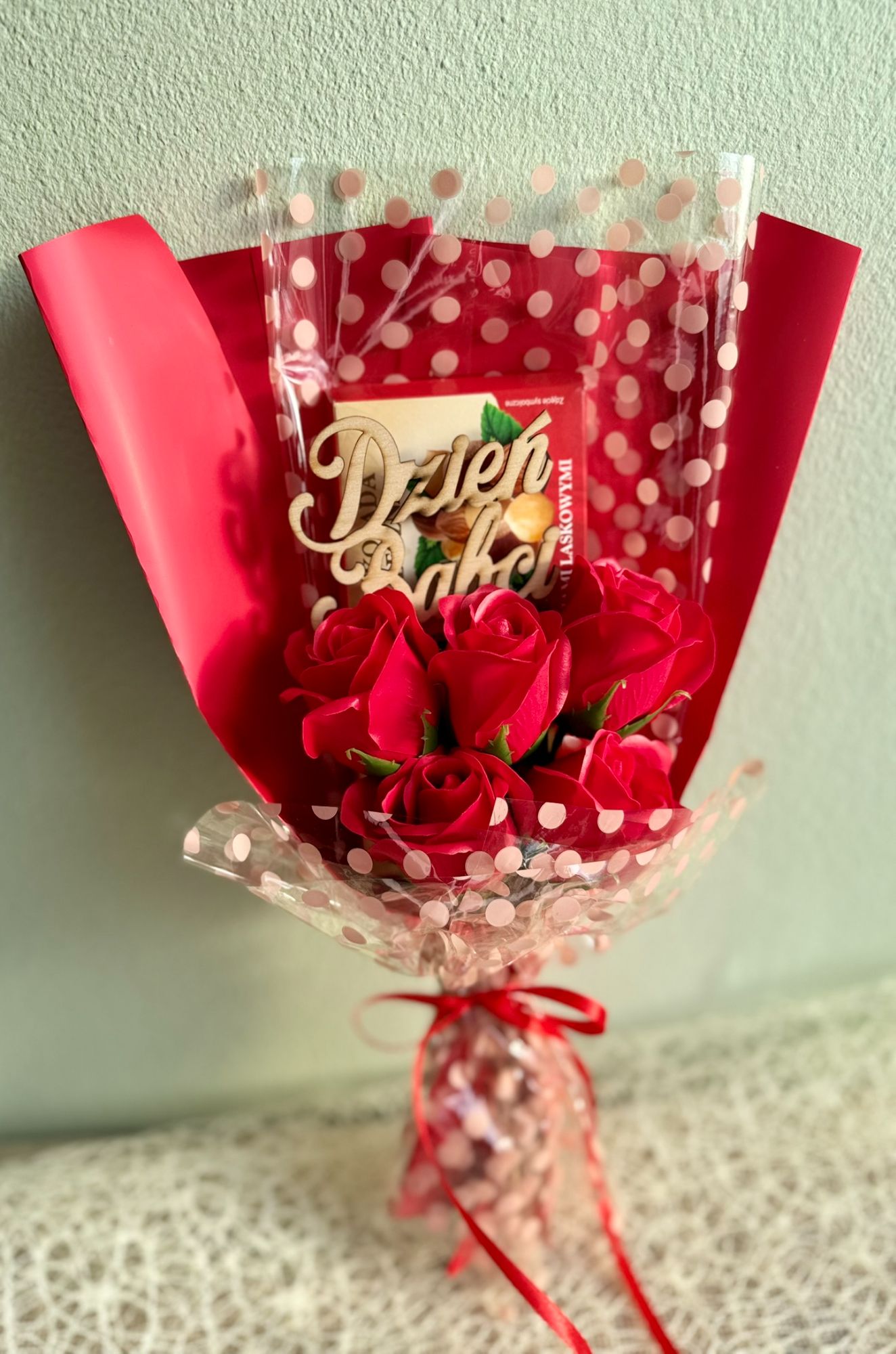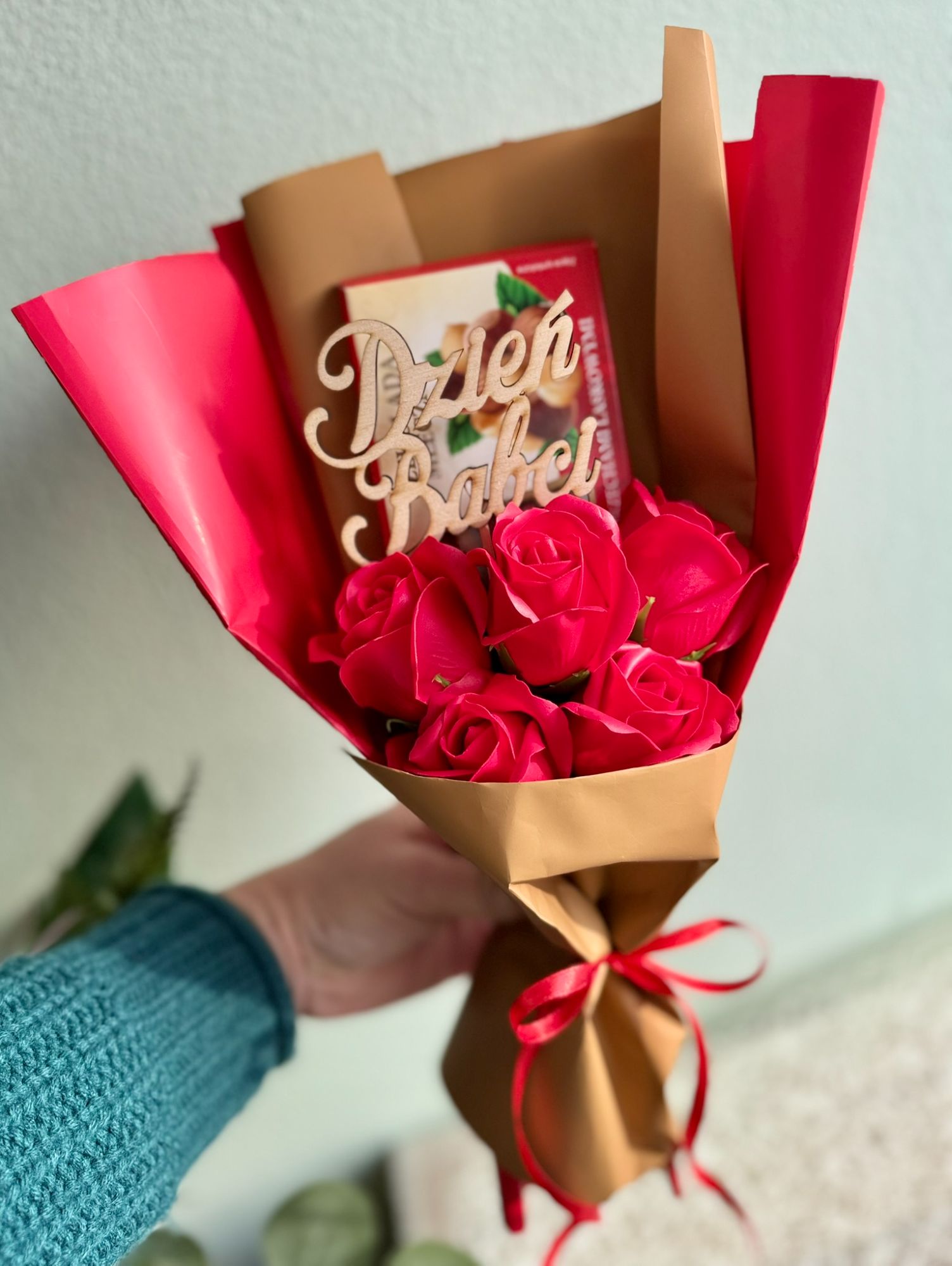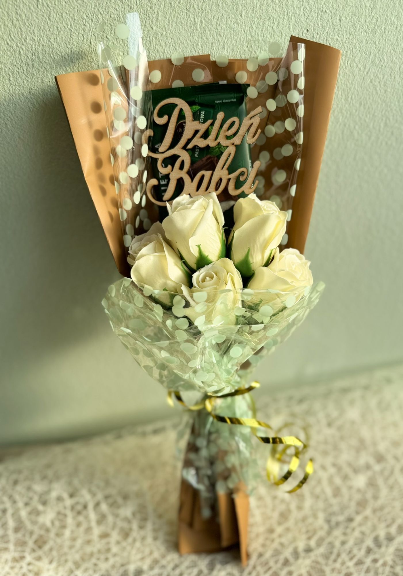 • 3. Bukiecik na Dzień babci z czekoladą i kwiatami mydlanymi.